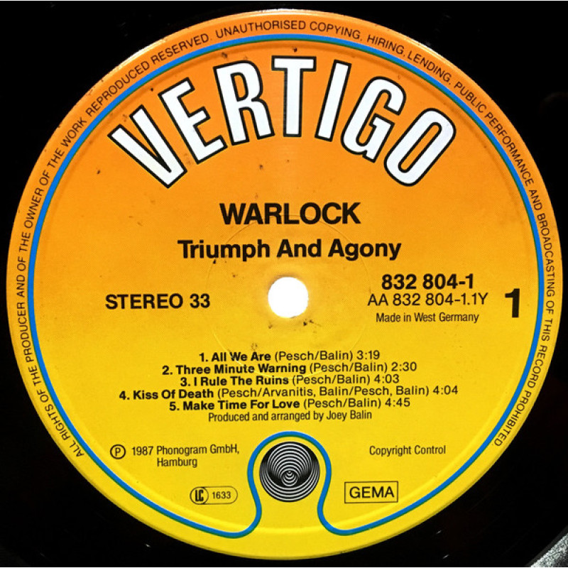 Виниловая пластинка Warlock - Triumph And Agony LP 1987